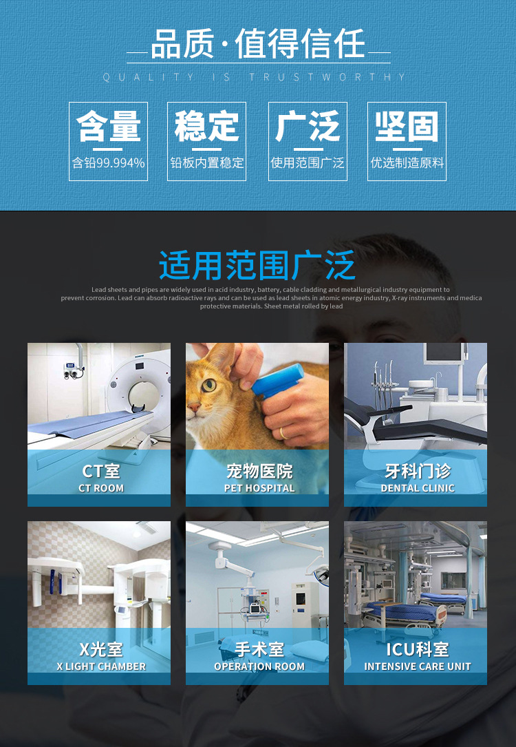 醫(yī)院X光室專用 防護鉛板 加工制造各種規(guī)格尺寸的鉛板、鉛磚、防輻射鉛板、鉛極板及其它鉛合金板,適用于化工、環(huán)保、醫(yī)用、核電力、航空航天、電aa鍍、機械、軍工等行業(yè)作防腐蝕、防輻射材料。醫(yī)用防輻射鉛板,加重鉛板,隔音鉛板,鉛玻璃價格,防輻射鉛板價格 醫(yī)用鉛板銷售 防腐蝕鉛板銷售 耐酸耐堿鉛板廠家 防輻射玻璃廠家防腐蝕玻璃銷售 鉛門制作 鉛板,指用金屬鉛軋制而成的板材,目前國內(nèi)常見的厚度為0.5-20mm,常用規(guī)格為1000*2000MM,國內(nèi)最好的機器可制作最寬1300MM,最長8000MM,多采用1#電解鉛制作,市面上也有采用回收鉛制作而成的。其品質(zhì)略差些,價格相差些許。鉛板,具有很強的防腐蝕,耐酸耐堿,耐酸環(huán)境施工、醫(yī)用防輻射,X光,CT室射線防護、加重、隔音等許多方面,而且是一種比較廉價的防輻射材料。