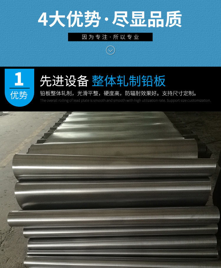 鉛板,可生產(chǎn)0.5mm-70mm 寬度2000mm以下耐酸堿的性能,在耐酸環(huán)境施工、醫(yī)用防輻射,X光,CT室射線防護(hù)、加重、隔音等許多方面,也是一種比較廉價的防輻射材料。公司擁有高標(biāo)準(zhǔn)的S1600型鉛板扎機(jī)是國內(nèi)先進(jìn)鉛板軋制設(shè)備,能根據(jù)客戶需求軋制最低0.5mm-50mm厚度的鉛板。完全符合強(qiáng)制性國家職業(yè)衛(wèi)生標(biāo)準(zhǔn)GBZ130-2013醫(yī)用X射線診斷放射防護(hù)要求的標(biāo)準(zhǔn),滿足各類醫(yī)療放射場所的需求。鉛板的含鉛量99.99%,為銀白色的重金屬,熔點(diǎn)327.502度,沸點(diǎn)1740度,密度11.3131,莫氏硬度是1.5,質(zhì)地柔軟,抗張強(qiáng)度小,主要用于制造防射線和x射線的防護(hù)設(shè)備,例如醫(yī)療CT室X光拍片室。