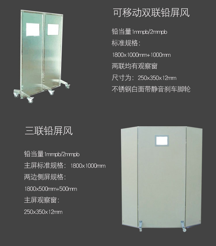 防護(hù)鉛屏風(fēng)可以分成落地單聯(lián)、雙聯(lián)、三聯(lián)鉛屏風(fēng),具體的鉛當(dāng)量與防護(hù)鉛屏風(fēng)的尺寸大小都是可以根據(jù)用戶的具體要求進(jìn)行定制的。